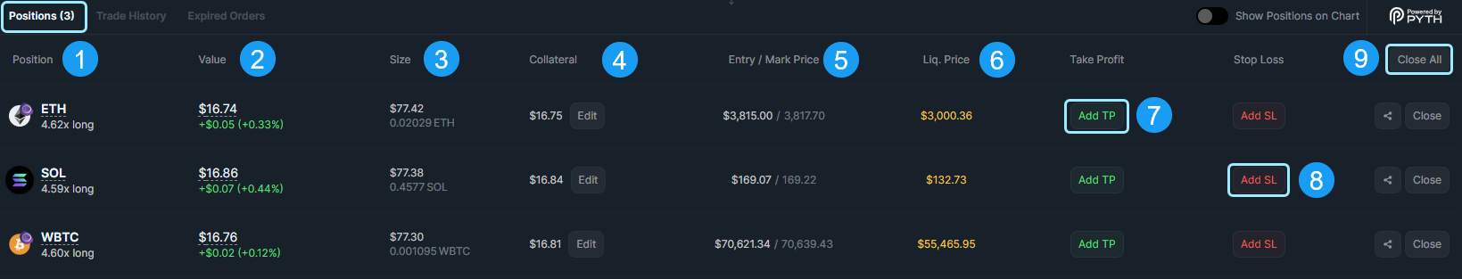 - Positions Tab: The Positions tab is where you can view and manage all your current open positions.