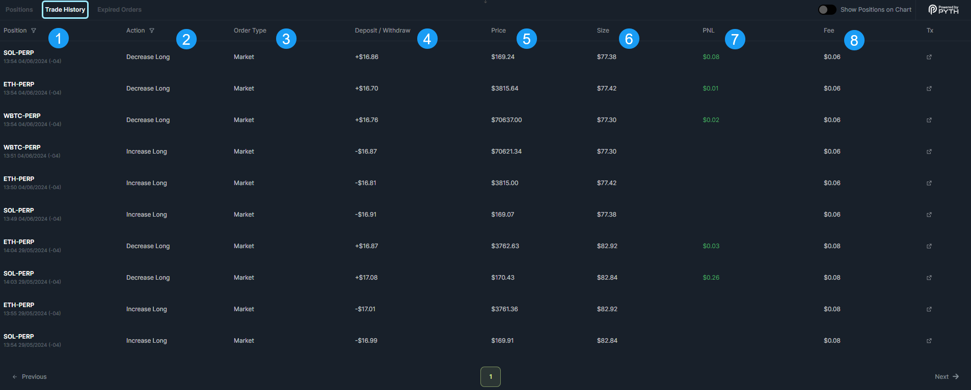 - Order Type: This column indicates the type of order that occurred for the position. For example, it could be Market, Trigger, or Liquidation.